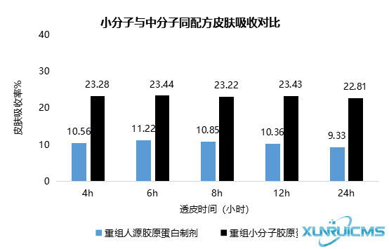 同濃度的重組人小分子膠原蛋白經(jīng)皮吸收率明顯高于中分子,吸收比率最高可達244.5%。重組小分子膠原蛋白被皮膚和皮下組織吸收的膠原蛋白可能作為儲存庫,具有持續24小時(shí)釋放和補充游離膠原蛋白的潛力,補充皮膚所需膠原蛋白的同時(shí),促進(jìn)自身膠原蛋白合成,補促結合效果更佳!