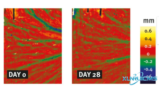 使用Placebo28天后,算術(shù)平均粗糙度下降了4%,平均峰谷深度下降了2%;使用SYN@-AKE28天后,算術(shù)平均粗糙度下降了21%,平均峰谷深度下降了20%